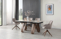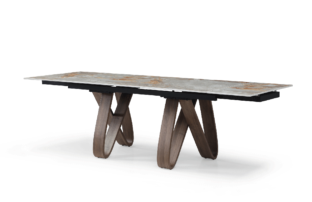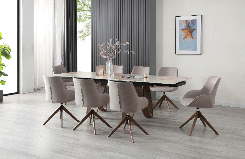 Table with marble top is high in contrast with streaks of brown and beige running throughout. Dining table rests on a wood base.