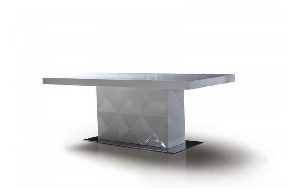 The Eva dining table features a smooth lacquer top demonstrating a bewitching appeal that is steadily supported by a lone, wide column in lacquer patterned pyramid blocks. Holding the whole weight of the table is a stainless steel flat rectangular frame that ably complements its geometric designs.