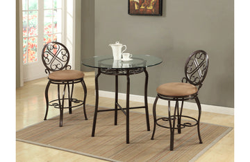 Allecra 3 Piece Counter Set - 36" x 36" clear glass counter table with 2 Taupe Microsuede traditional style memory swivel counter stools.