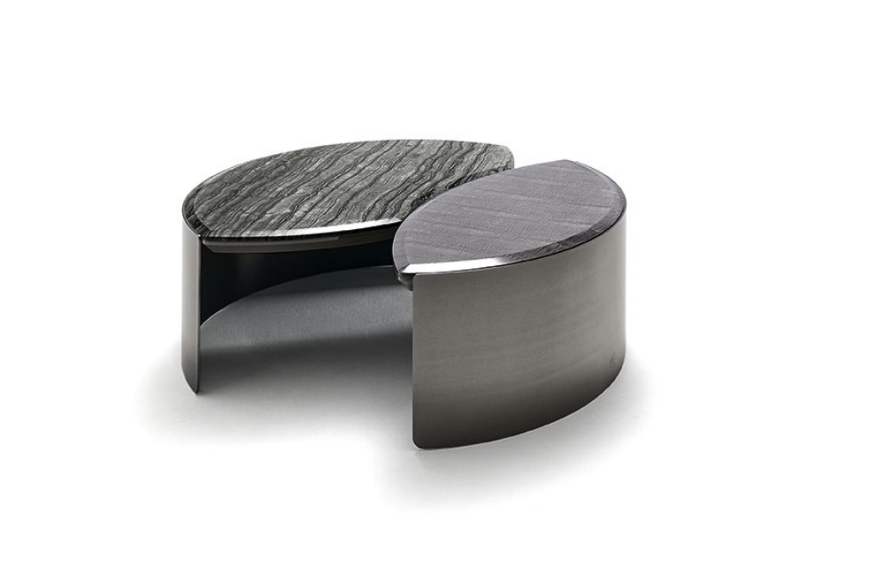Description Round cocktail table with two tops in Black Kenya marble.Curved legs in satin...