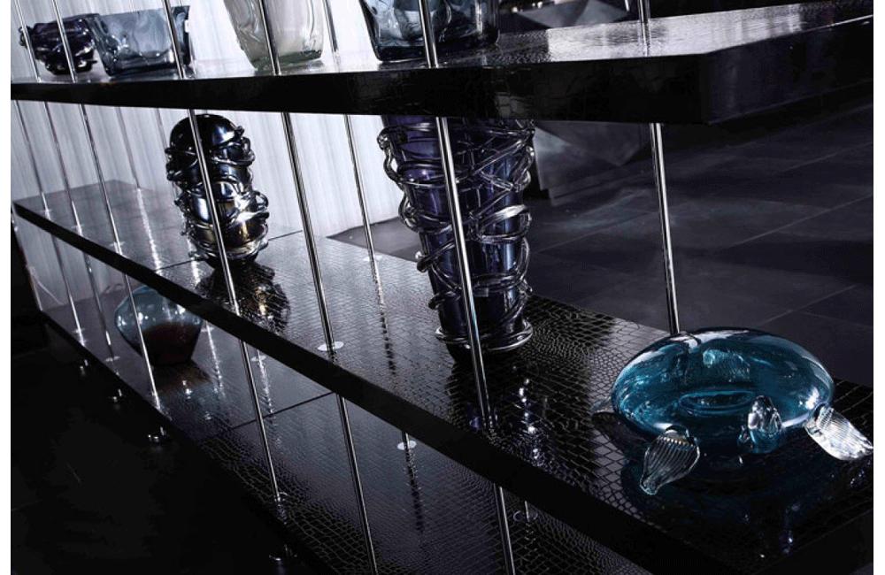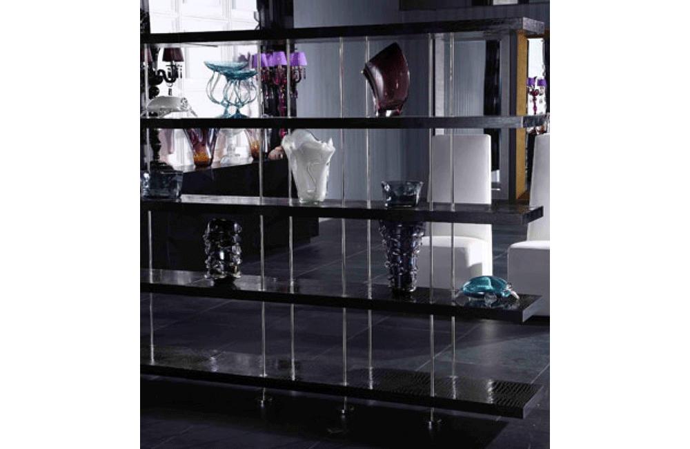 Description The Stafford black room divider has 4 levels of shelving in black crocodile lacquer, supported by...
