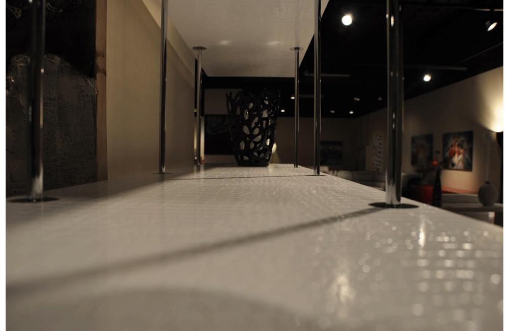 Description Featuring seven clear glass shelves and a glossy white central pole made from metal...
