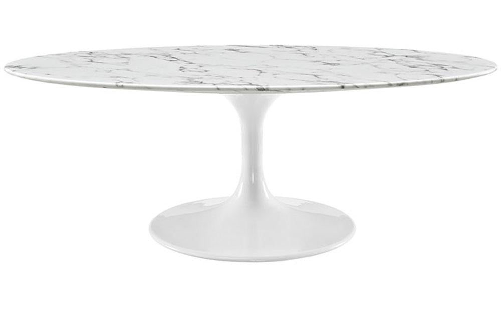 Features Ricardo 2" Oval-Shaped Artificial Marble Coffee Table in White Reflecting a seamless organic shape...