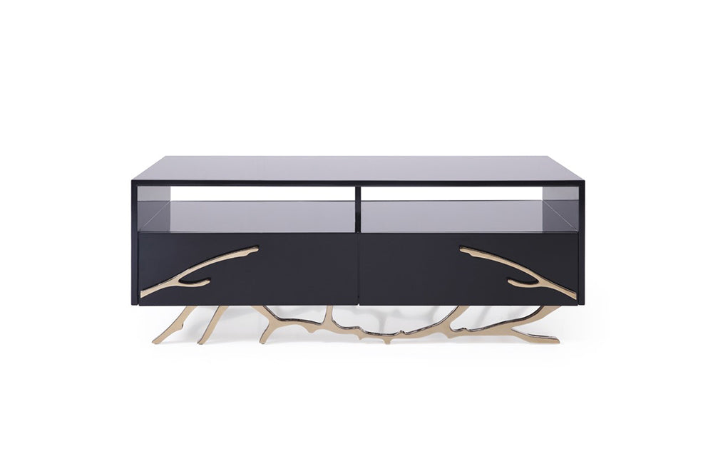 Description Black High Gloss Finish Gold Stainless Steel Leg & Handles 2 Drawers 2 Storage...