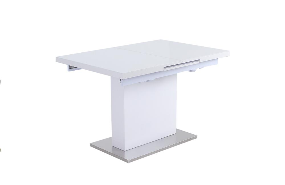Description Lara Glass dining table with pop up extension. White Tempered glass over a lacquer....