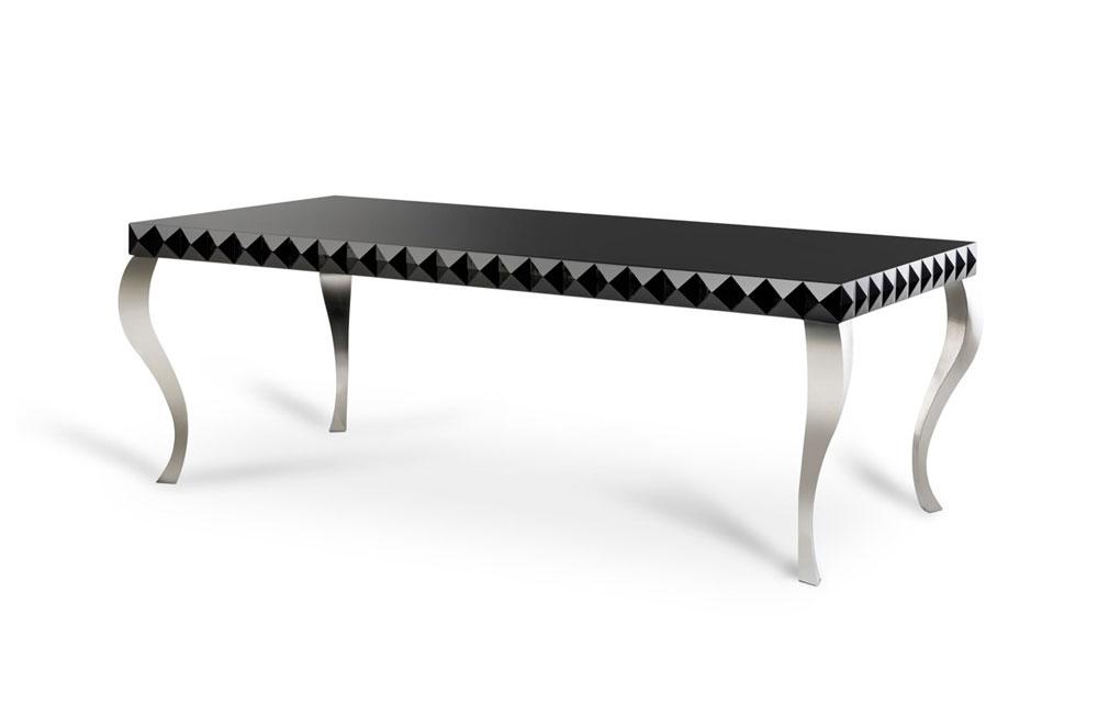 The Mia modern black lacquer dining table features lacquer patterned pyramid blocks on the edges of the smooth lacquer table top for a lustrous look. Transitional stainless steel legs with soft curves offers steady support that completes the table's sophisticated look. This lacquer dining table is available also in White.