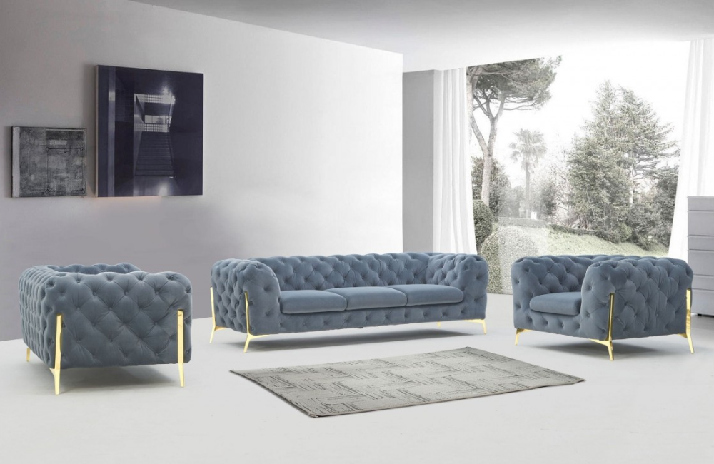 Description Set Includes: Sofa, Loveseat & ChairUpholstered in Velour FabricColor: Dark Grey Tape 96Tufted Seat...