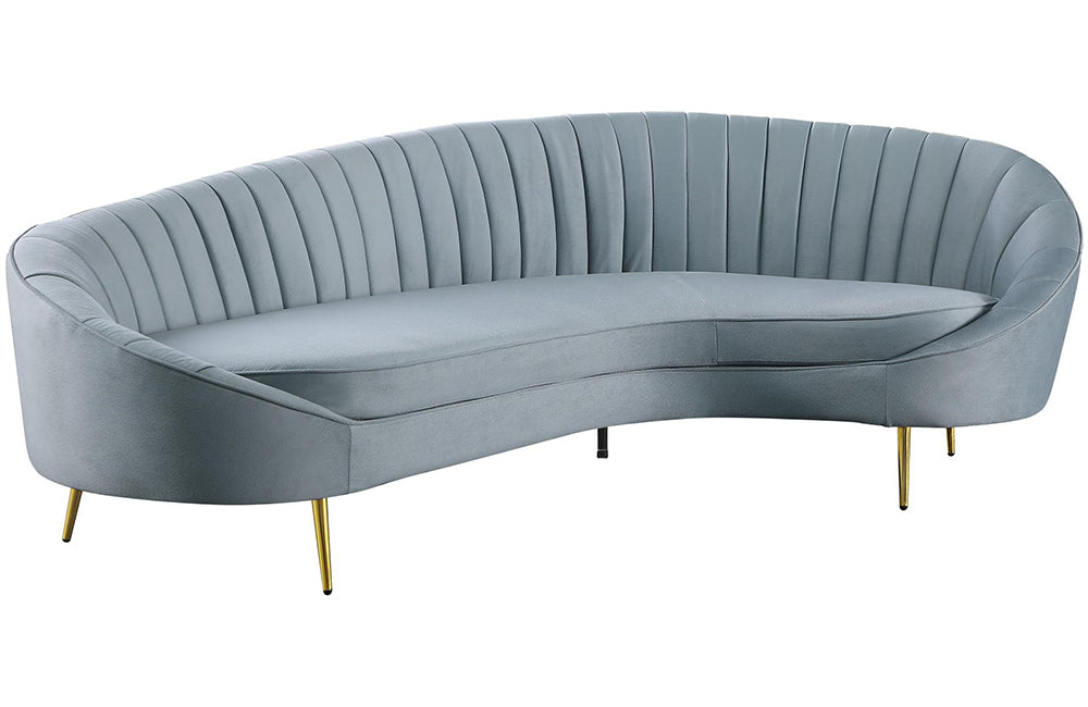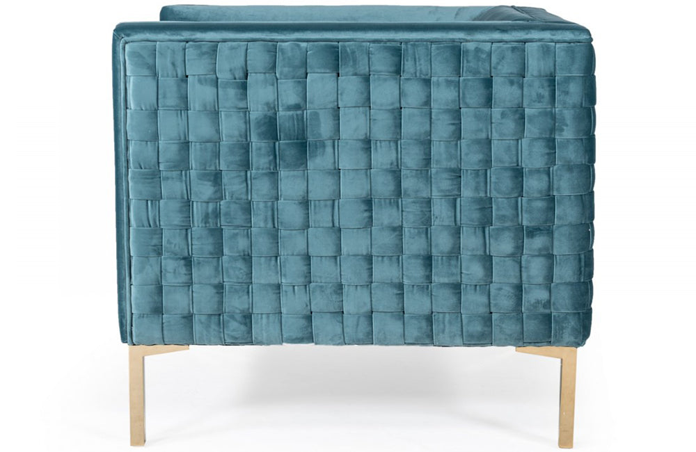 Description Upholstered in Light Teal velvet fabric (FA-61) Flush front tuxedo arms Woven fabric design...