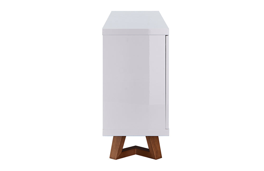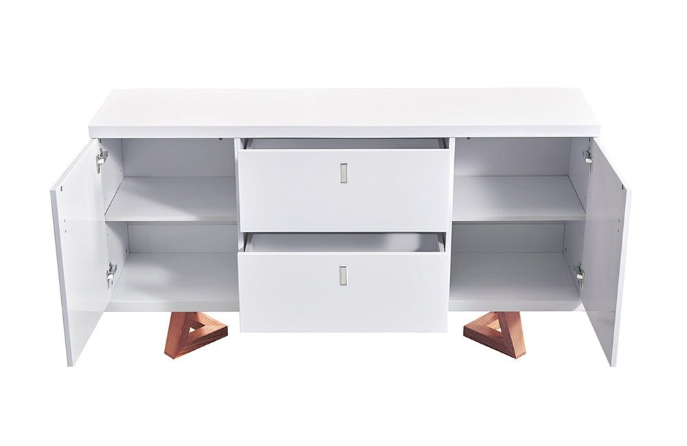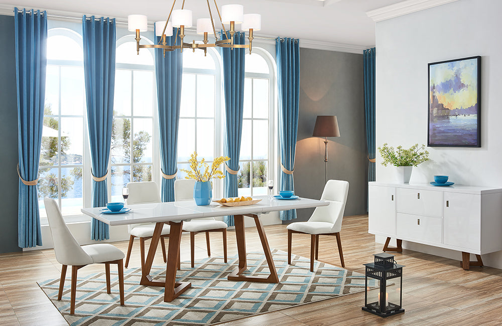 This Dining Set offers a contemporary approach in design. Durable wooden construction combined with rich high gloss finish give this set its ultra modern exterior while the white color of the set adds a touch of the elegance. The Dining Set consists of: Dining Table, 6 Side Chairs and Buffet