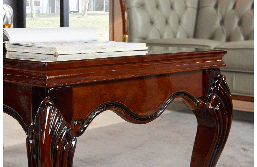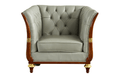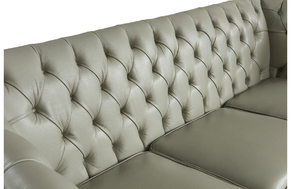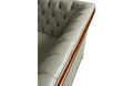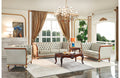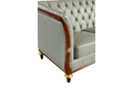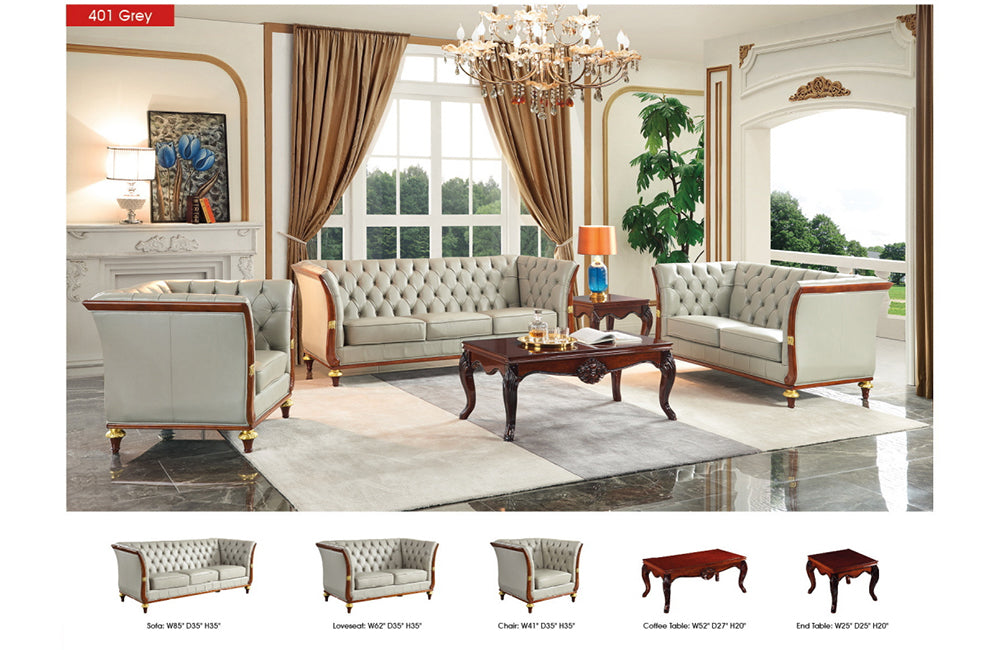 High-End Living Room Set in light grey leather color with brown wood and gold accent.