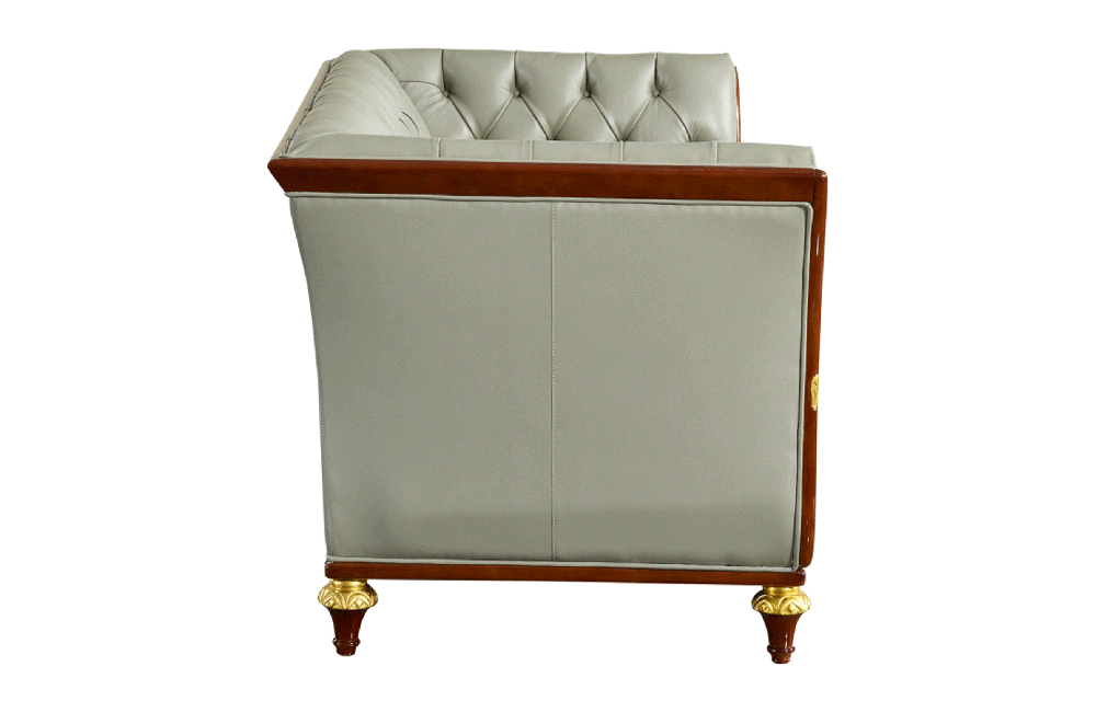High-End Living Room Set in light grey leather color with brown wood and gold accent.