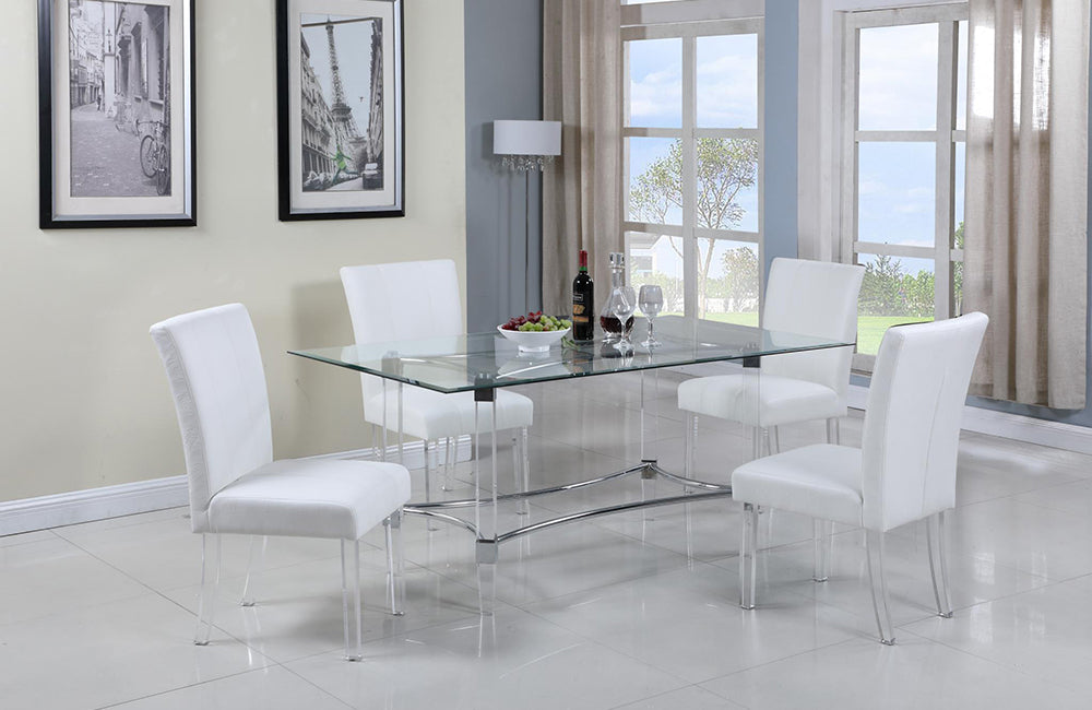 4038 Rectangular Dining Table Base Rect Base w/ Metal Base & Solid Acrylic Legs Finish: Chrome Standard Pack - Semi KD, 36" x 60" Rectangle w/ 1" Radius Corners 10mm Flat Polished - 1" Bevel Clear Standard Pack, 4x 4038 Parson Chair Flare Back Parson Chair w/ Acrylic Legs Upl.: White PU Finish: Clear 2 per pack - Semi KD Standard Pack.