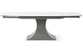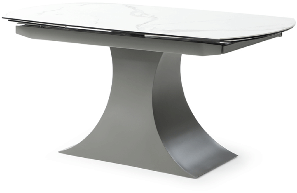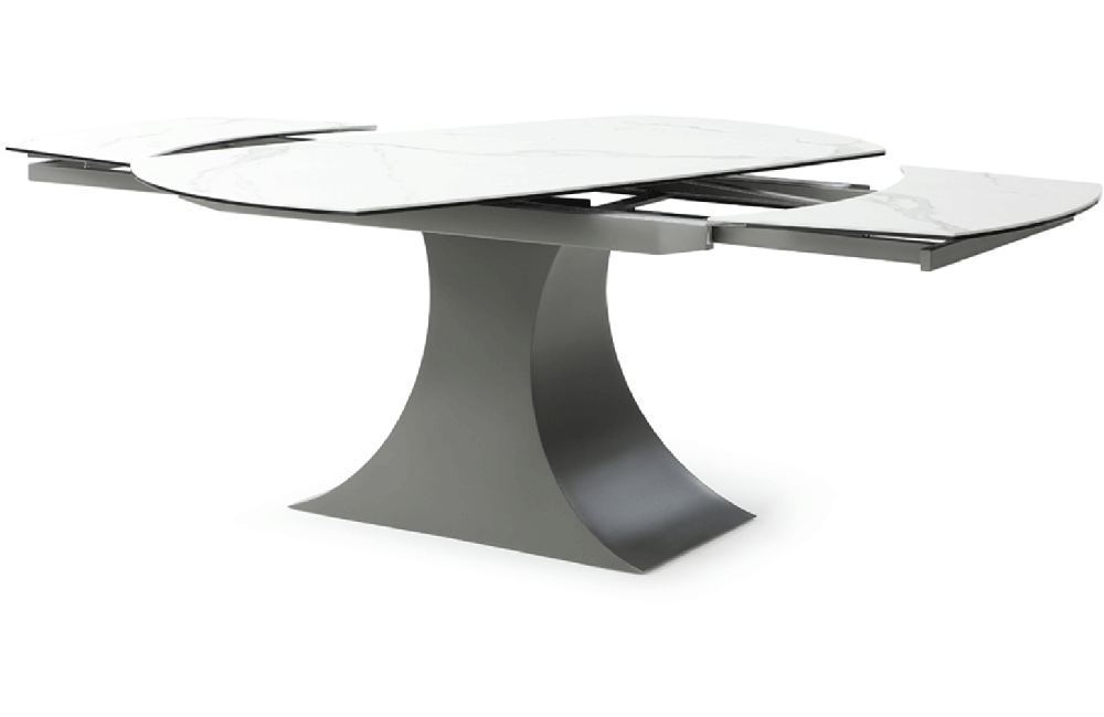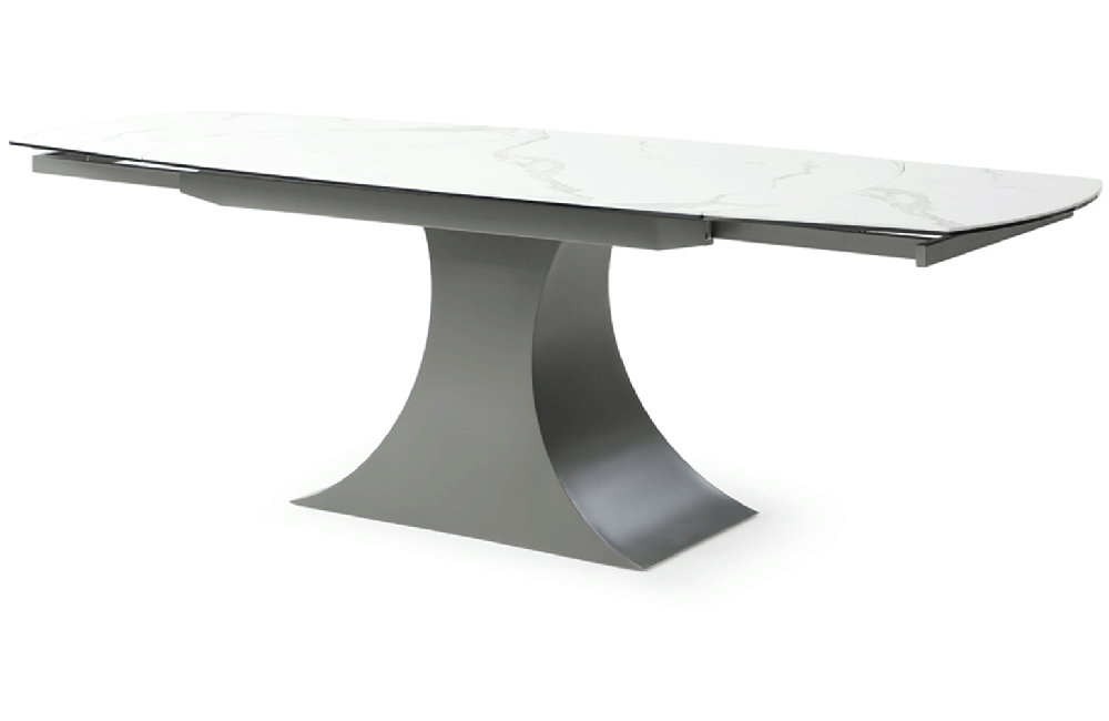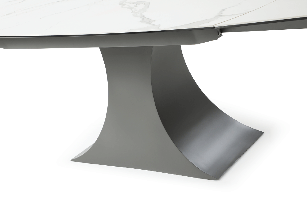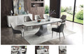 Very contemporary dining set with steel base in matt gray lacquered and top in ceramic stone finish. Matching grey chairs and white buffet with ceramic top will be a nice addition to any dining area.