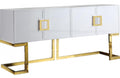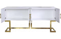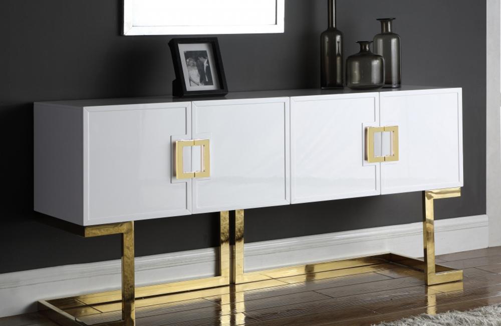 Ensure the items you need at mealtime are close at hand with this handsome Aaden Sideboard Buffet from Meridian Furniture. This indispensable piece is a modern marvel with its contemporary design featuring black lacquer with a gold stainless steel trim and base. Open the doors to reveal a large area that's suitable for storing everything from serving bowls to out-of-season dinnerware.