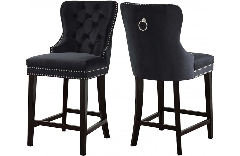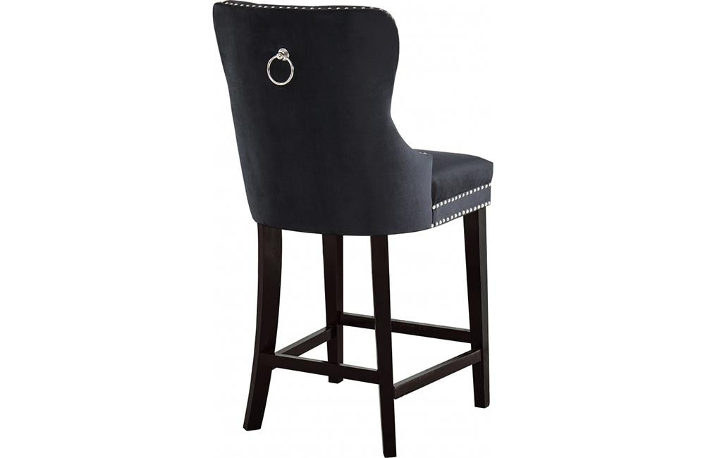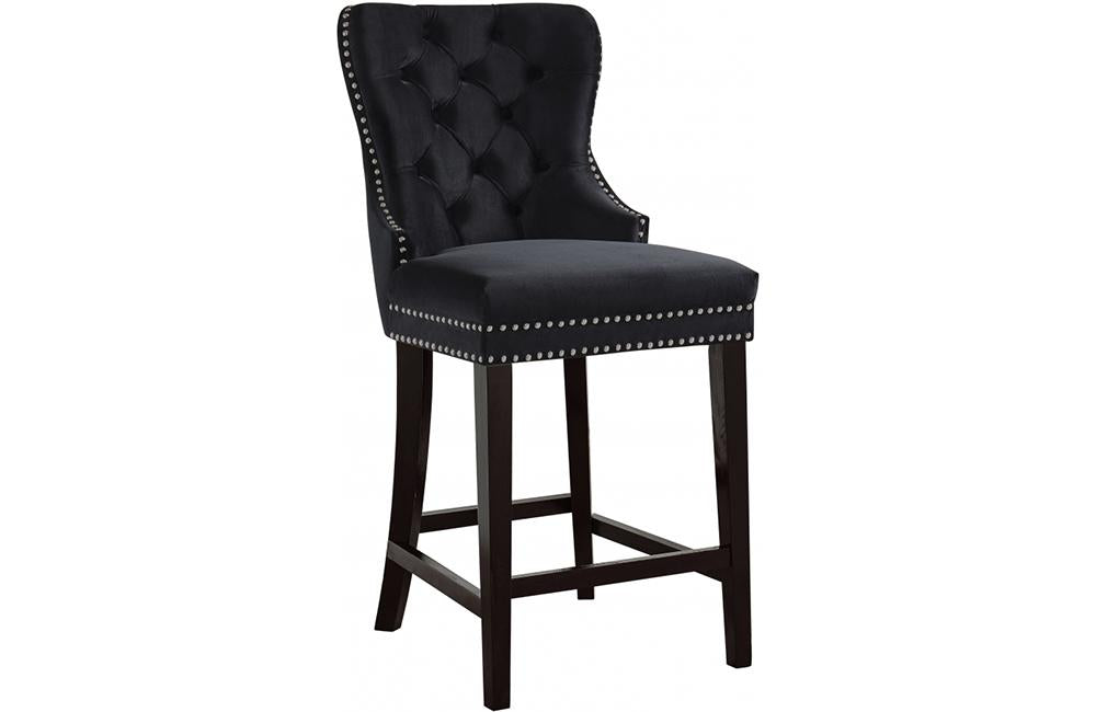 Lounge in luxurious style with the Abella velvet counter stool. Featuring a curved high back, plush cushioned seat and deep tufted black velvet upholstery studded with chrome nailheads, this counter stool is sure to take your dining experience to a whole new level. Espresso wood legs provide sturdy support and complement the stunning pink upholstery for a sleek, contemporary design.