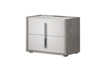 The sides and back of the Ada case goods feature panels that replicate design and texture of natural slate stone in grey color tonality whereas the front has a white matt lacquering finish to create an organic-modern style. The “tray design” visible on the top is a classic modern silhouette that has never faded and add visual character. The metal handles are lined up to create a vertical line partially mirrored on the headboard. Nightstands, chest and dresser have generous sizes to fill a roomy bedroom space. The Ada bedroom collection adds an organic touch to your home.