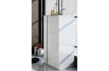 Modern high-end bedroom composition in white high gloss finish will add your house beautiful and clean look. Bed available in King and Queen Size with Storage or without. Chest , Double Dresser and 2 Door wardrobe Available. All drawers are equipped with self closing mechanisms.