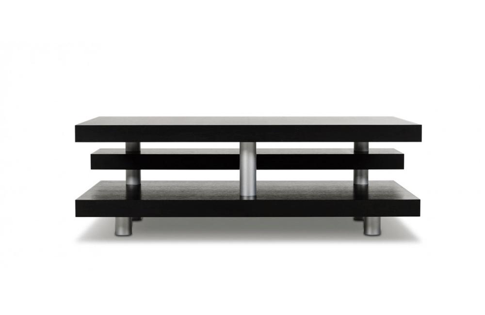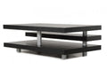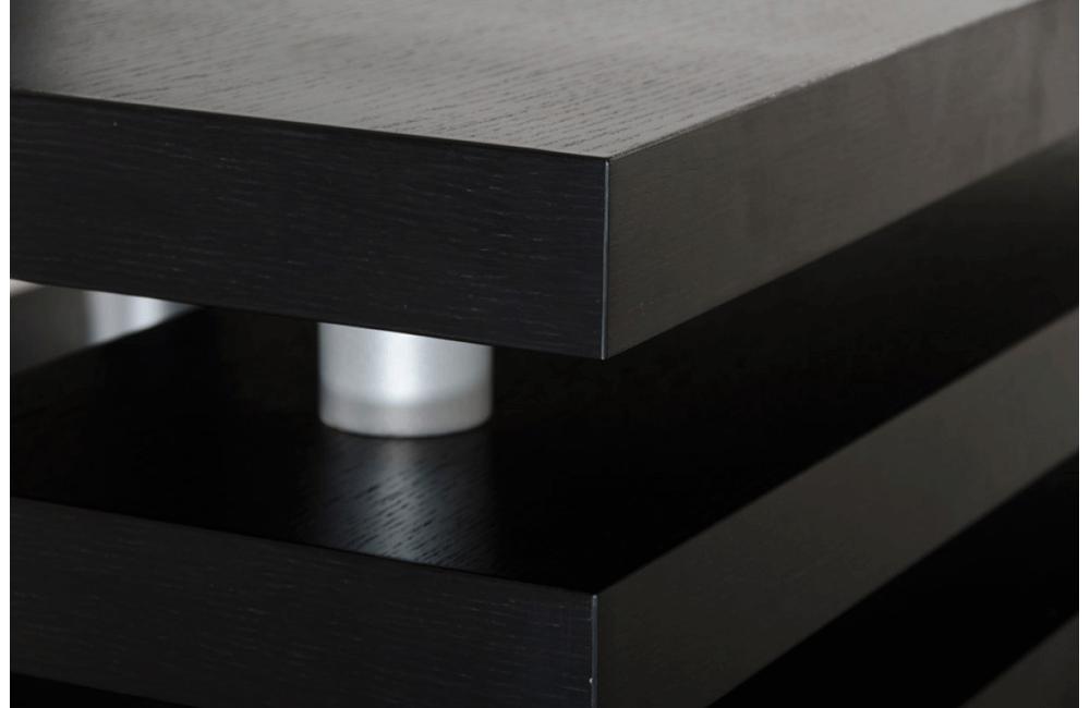 The three tiered Adrian coffee table provides an intriguing design and functional storage space. Finished in a black oak veneer with stainless steel piped legs.