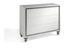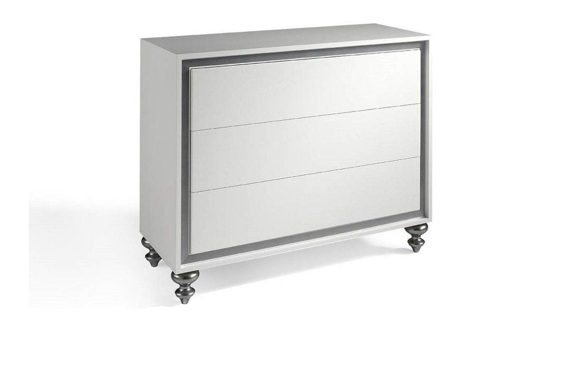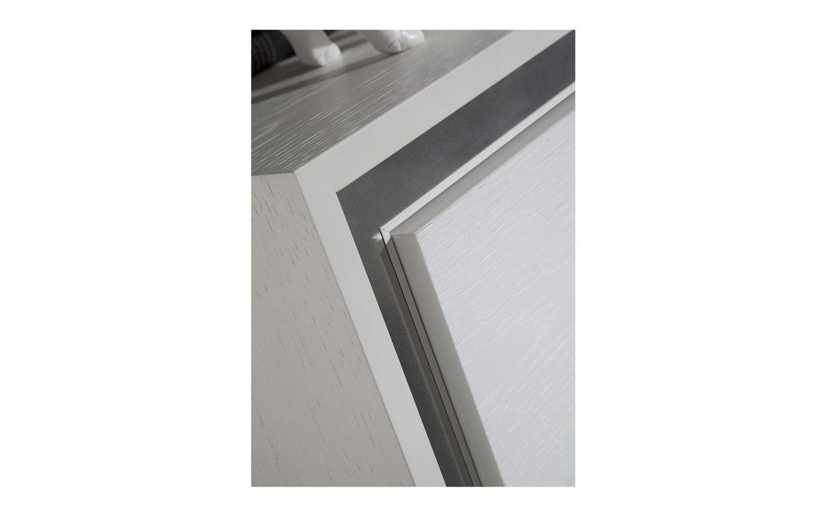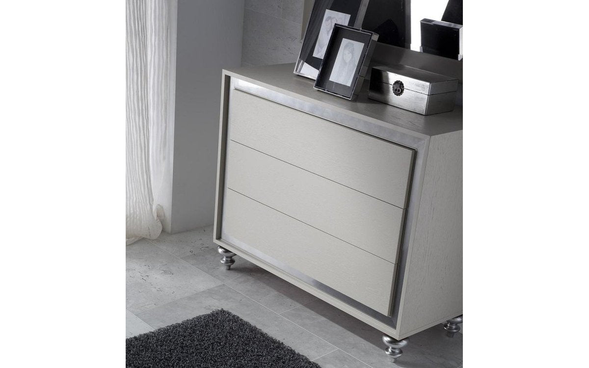 J&M is proud to present our newest addition to our Premium bedroom sets. Crafted from the highest quality materials, these sets are made in Spain & fuse old world craftsmanship with contemporary design to produce quality furniture with sophisticated appeal. The Alba Premium Bedroom Set features solid wood construction, with silver accented oak veneer. The headboard is skillfully hand carved for a distinguished look which is nothing less of astonishing. The case goods are crafted from solid wood and features matching silver accents with soft closing drawers using premium hardware by Blum, a world-renowned German manufacturer that sets the standards for the finest quality furniture hardware.