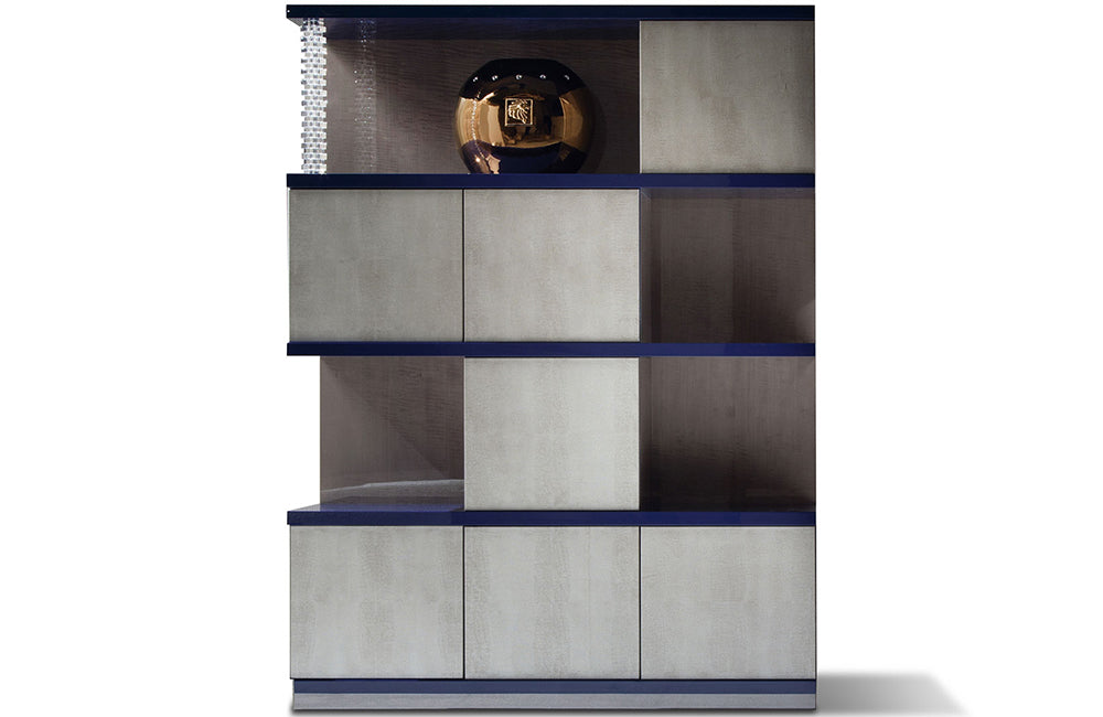 7 doors in silver lizard printed leather with inside in cobalt blue high gloss polyester finish.
