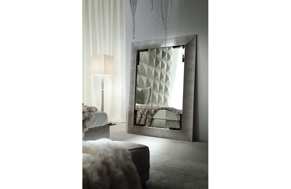 Floor mirror in combination of silver lizard printed leather and accents of stainless steel