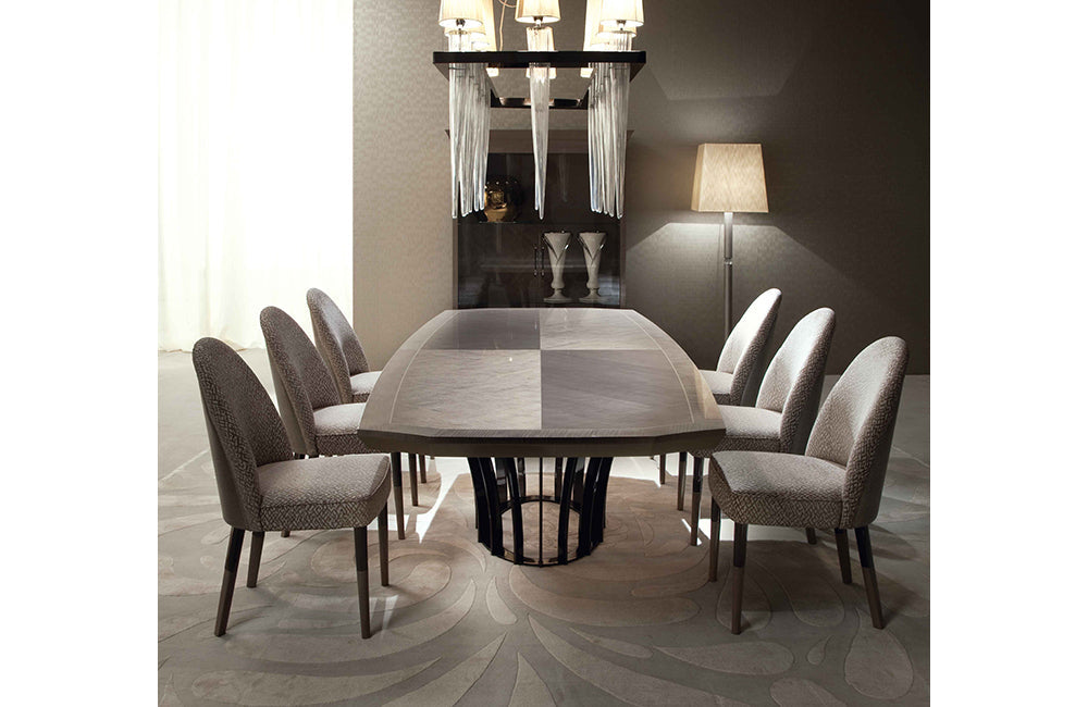 Boat shape oval table in tiger African sycomore veneer with high gloss polyester finish.