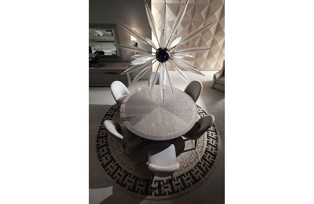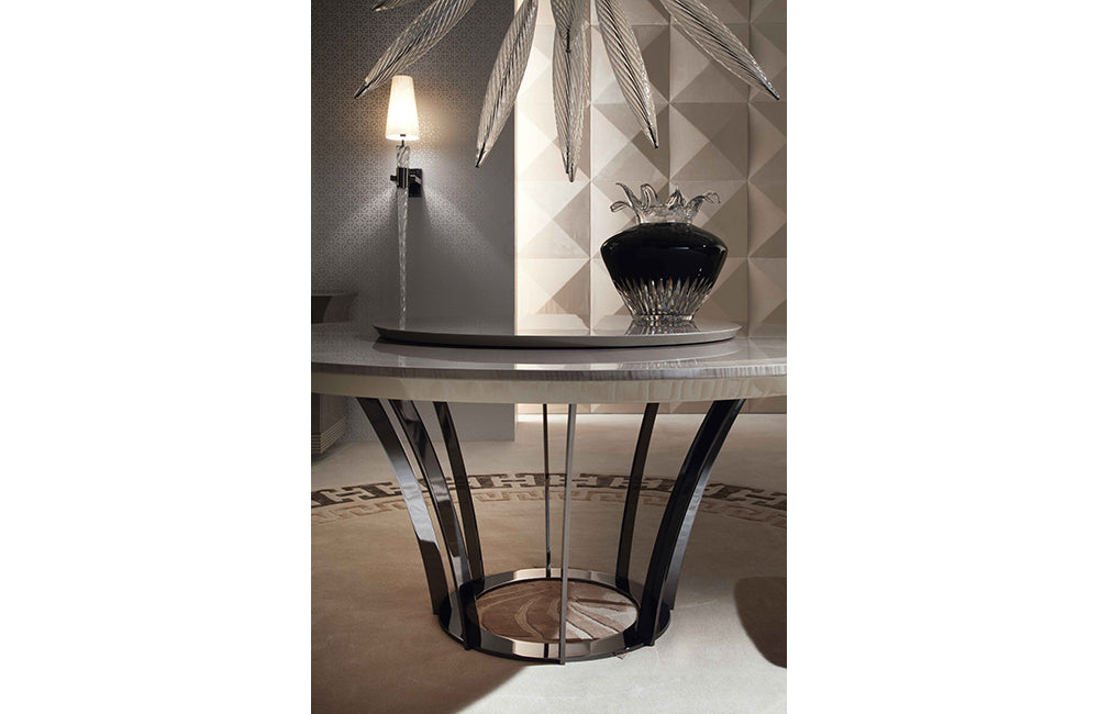 Round table in tiger African sycomore veneer with high gloss polyester finish.