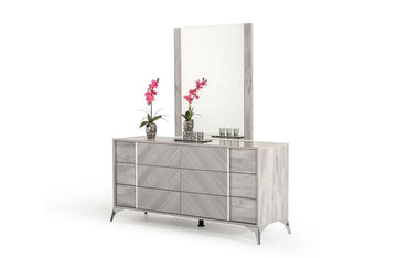 Featuring modern contemporary lines, the Alexa Italian Modern Grey Dresser boasts of a refined gloss finish. It is equipped with 6 spacious soft-closing drawers with metal accents allowing you to organize your stuff for a clutter-free room. The angled metal front legs and tubular back and mid legs keep up to the aesthetics of this modern dresser. The Dresser can be ordered also with Mirror.