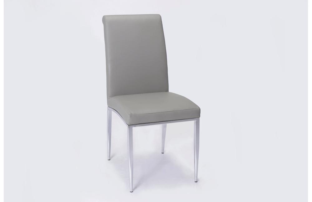 A comfy dining side chair covered in gray faux leather, ideal for any contemporary dining room setting. Available also in white .