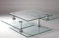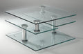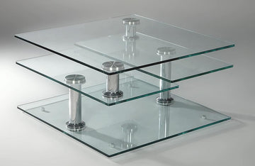 Square Swivel Motion cocktail table. All tempered clear glass. Chrome plated pillar supports. Middle shelves swivel out. Glass surfaces move on chrome arms, Each shelf pivots independently.