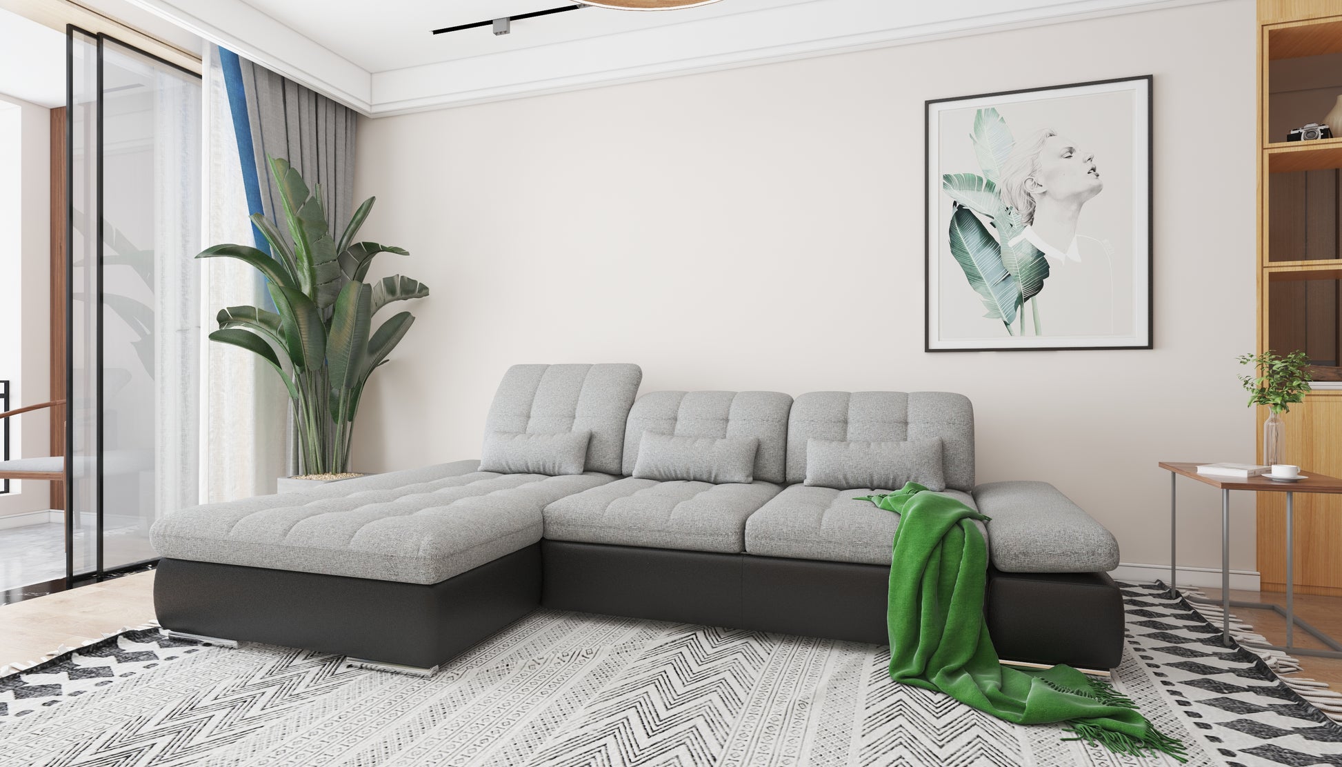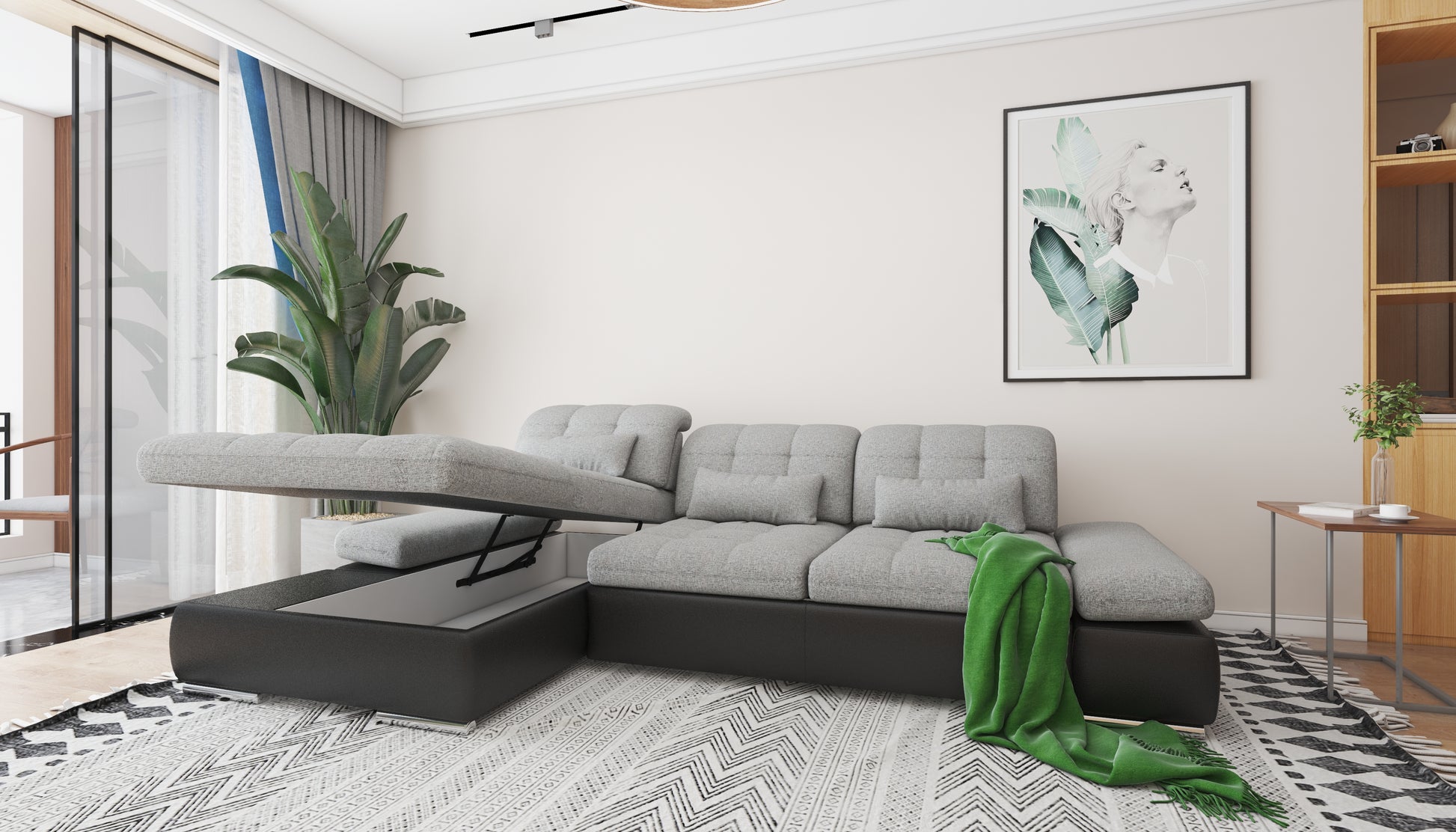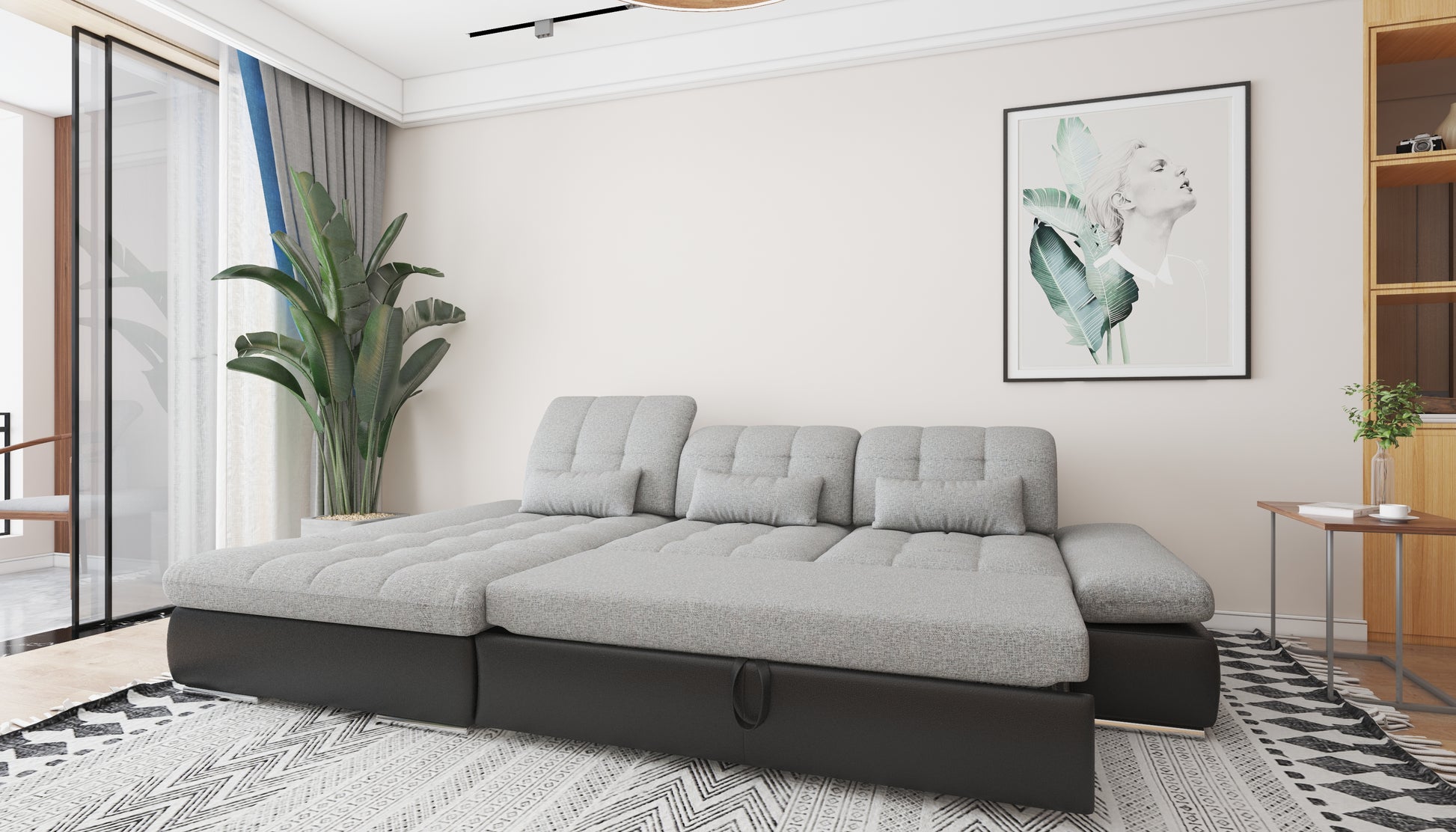 Alpine Two Tone Sectional Sofa Bed and Storage in Grey Fabric and black vinyl bottom