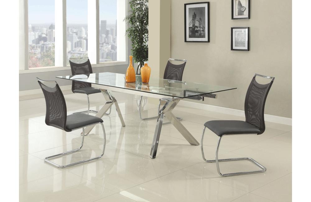 Contemporary extendable dining table. Self storing extension opens table easily. Two pop-up extensions makes table open from 62.99" to 94.49". Tempered clear glass table top is easy to clean. Polished stainless steel dancing legs are sturdy and durable. Easily Assembled