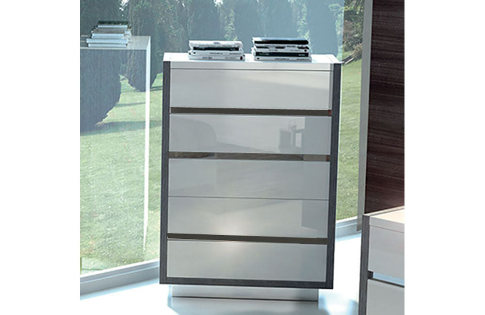 This Set Collection has a modern feel and look. The finish is a high gloss white and silver tone. The Collection brings the modern crisp look and feel with simple chrome finish pulls and legs. The collection gives the room a rich, clean look and an open airy feel. The Bedroom Set with Sleigh Bed consists of Queen Size Bed, Nightstand, Dresser and Mirror. The Bed is available in Queen and King Sizes. The 5-Drawer Chest is an optional items.Straight panels are in chipboard, then veneered (veneer being a thin layer of solid wood); then the veneers are lacquered using a 6 steps/layers of UV high gloss polyester lacquer. Manufactured according to European and international standards.