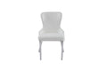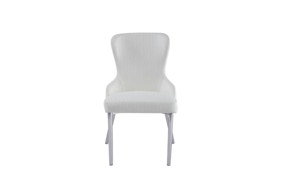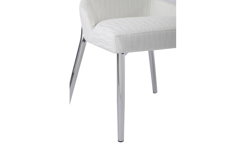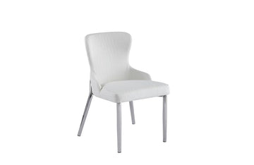 This side chair is upheld by sturdy, polished stainless steel legs and a lovely art novea styled seat and back upholstered in white leatherette.