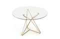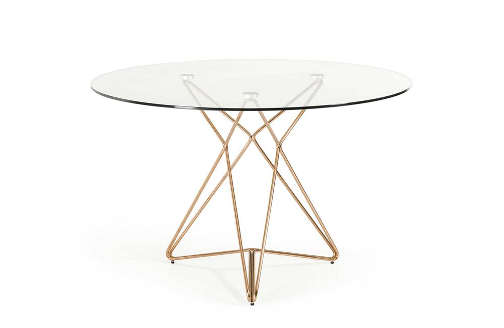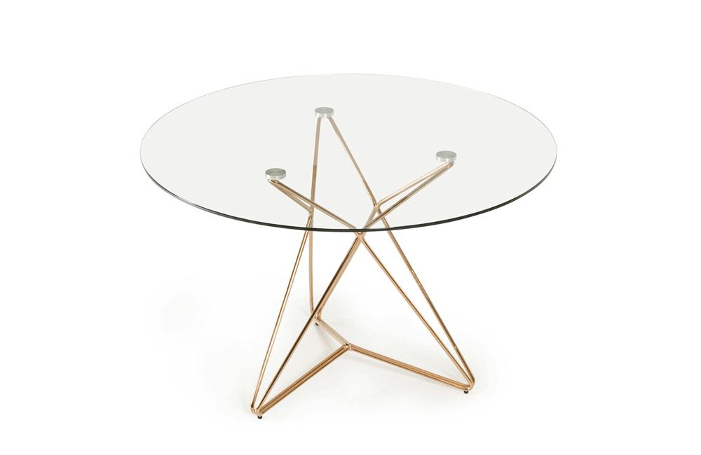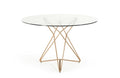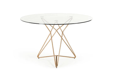 Ashland Modern Glass Round Dining Table features a dainty 10 mm round tempered clear glass top perched on a polished "star-shaped" stainless steel frame with a shiny rose gold finish. This modern glass round dining table seats 4 comfortably, has a dimension of W47" x D47" x H30", and requires some assembly.