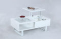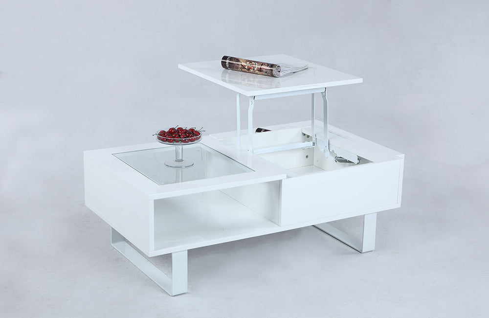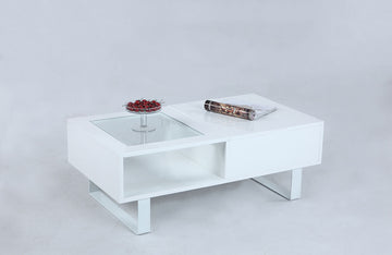 This slick, dazzlingly white cocktail table would make a great addition to any modern style living arrangement. It features a clear tempered glass insert. 1 side raising top, reveals a hidden storage option! If you're looking to make a contemporary statement, look no further.
