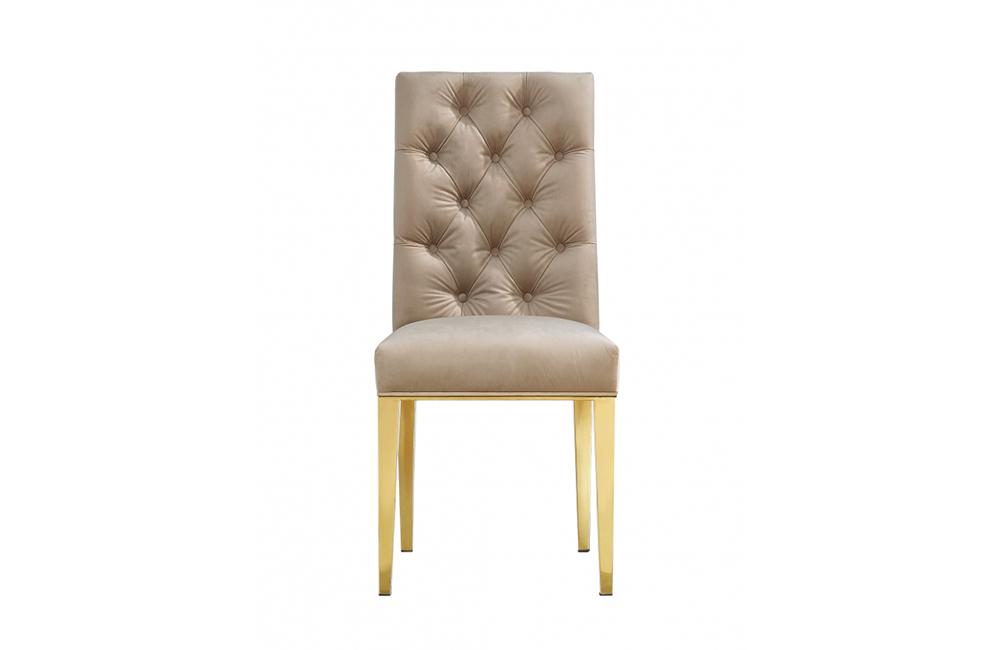 Turn to these Babson beige velvet dining chairs for a modern look in your contemporary dining space. This chair features a classic parsons design with a slightly slanted back that's button tufted to give it a textural look. The legs are made from stainless steel to give them strength and added support as you sit, and they're finished in a rich gold tone hue for a regal and sophisticated look.