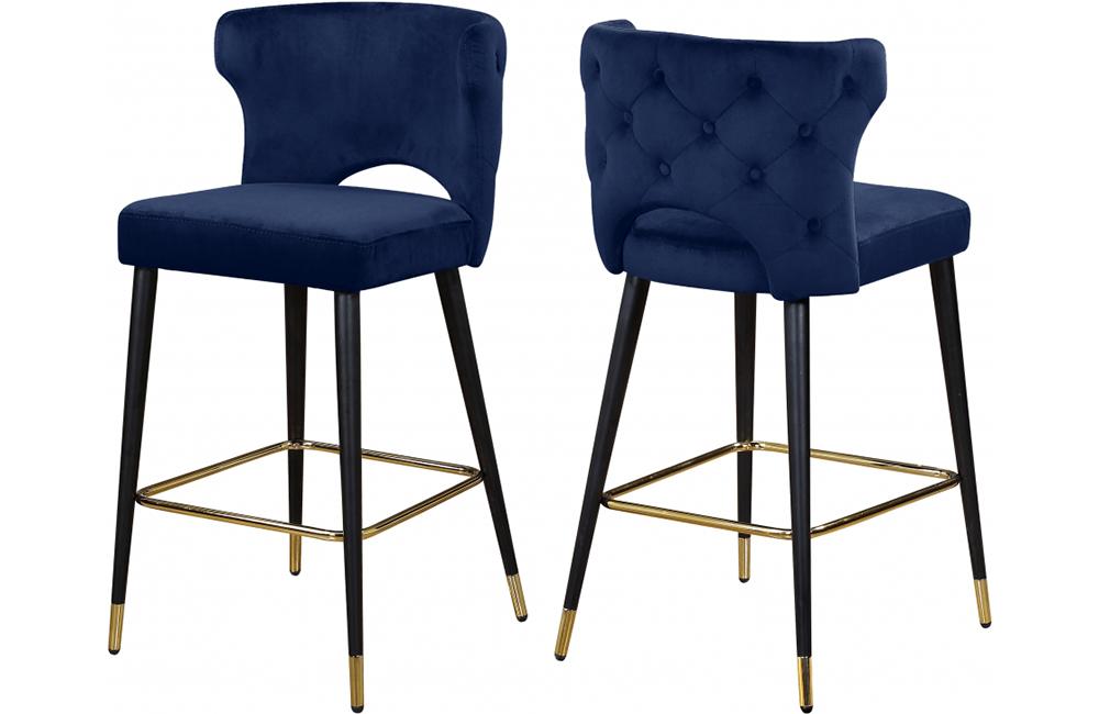 Sit comfortably on this Bahati Velvet Stool. The back and seat cushions are plumply stuffed for enhanced comfort and covered in rich velvet upholstery to give your room a burst of color and jewel-toned fun. This stool has black metal legs with gold tips for added contemporary panache, and it's built strong and tough, so it stands up to heavy daily use without breaking a sweat. These stools can outfit any bar or kitchen counter area.