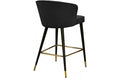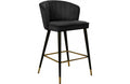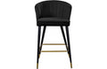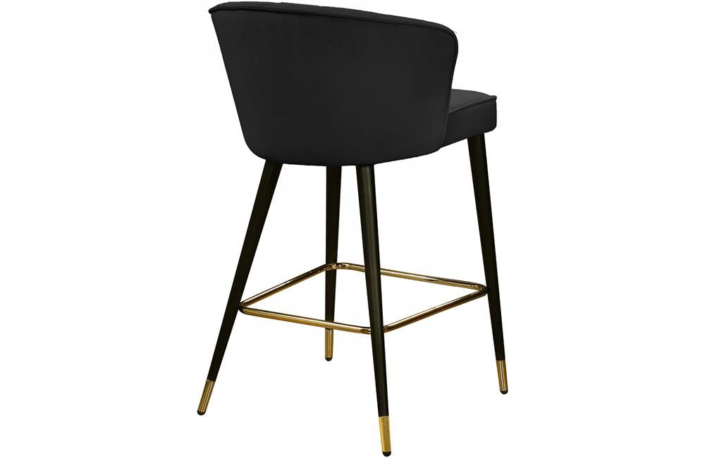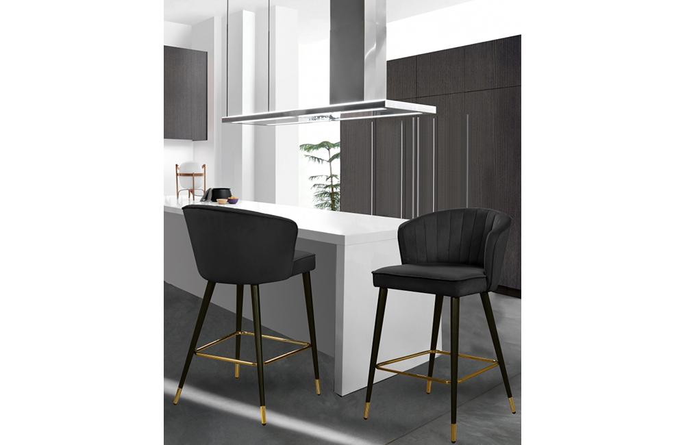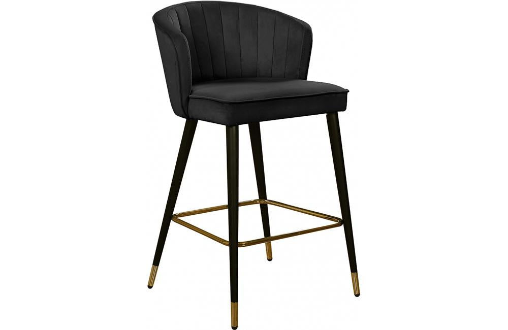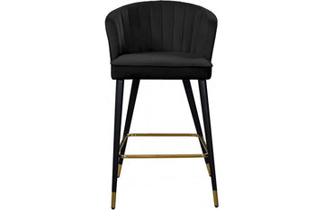 Give your kitchen counter or home bar a fresh new look with this Bairbre Velvet Stool. The shell-shaped back and channel tufted design draw the eye, making this stool an attention-commanding addition to your space. The sleek black metal legs flare slightly to create a modish silhouette, while goldtone tips on the ends and a goldtone foot rail complete the look. Rich velvet in a neutral hue makes it easy to blend this stool in easily with any color scheme.