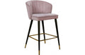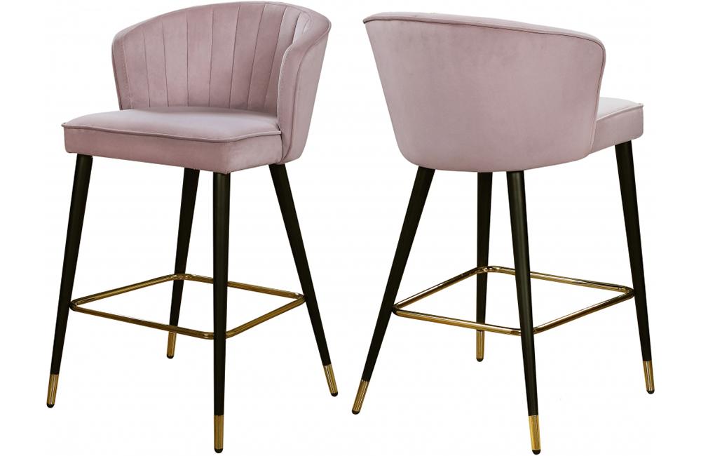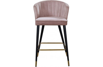 Give your kitchen counter or home bar a fresh new look with this Bairbre Velvet Stool. The shell-shaped back and channel tufted design draw the eye, making this stool an attention-commanding addition to your space. The sleek black metal legs flare slightly to create a modish silhouette, while goldtone tips on the ends and a goldtone foot rail complete the look. Rich velvet in a neutral hue makes it easy to blend this stool in easily with any color scheme.