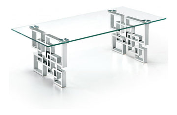 Enjoy a contemporary look in your living room or den with this stylishly elegant Banner chrome coffee table. This Meridian Furniture table is made from glass and metal for a sleek, modish look. The base features a geometric design with intertwined squares that form two pedestals. The top is crafted from thick, clear glass that allows the beauty of the base to shine through completely. A chromed finish shores up the design, adding to its up-to-the-minute feel.