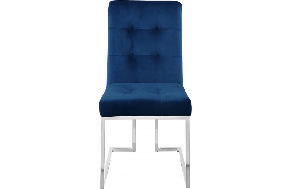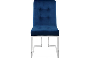 Dine in sophistication and elegance when you're seated in this Banner navy velvet dining chair. This pretty chair has a modish look that's suitable for nearly any contemporary décor theme. The base is made from stainless steel and has been given a rich chrome finish that lends it added modern panache. The seat is thickly padded and welcoming to the body as you sit through mealtime and converse with family and friends. Plush navy velvet upholstery with tufting on the back and seat cushions finishes off the design on a svelte note.