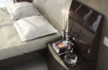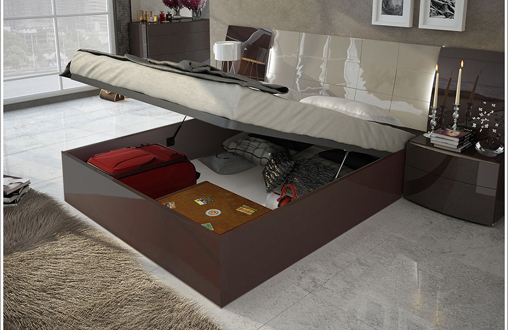 European exclusive design and construction. Brown lacquer finish wood with easy to use large drawers equipped with smooth railing mechanism. Platform bed with the beige-grey and brown combination headboard.