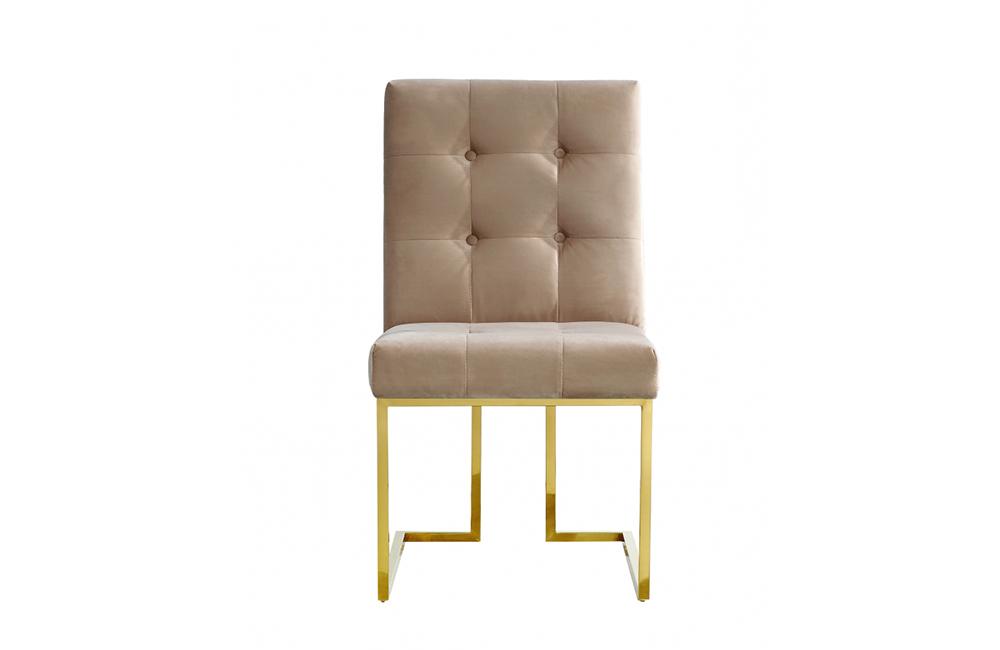 Elevate your dining experience with this Beckham Beige velvet dining chair. A boxy geometric shape makes this chair an uber modern addition to your space, while a base of stainless steel makes it durable and tough, so it holds up to heavy daily use. The gold tone finish on the base contrasts nicely with the black velvet upholstery used on the seat and back. Heavy tufting adds to the rich appeal of this beautiful design.