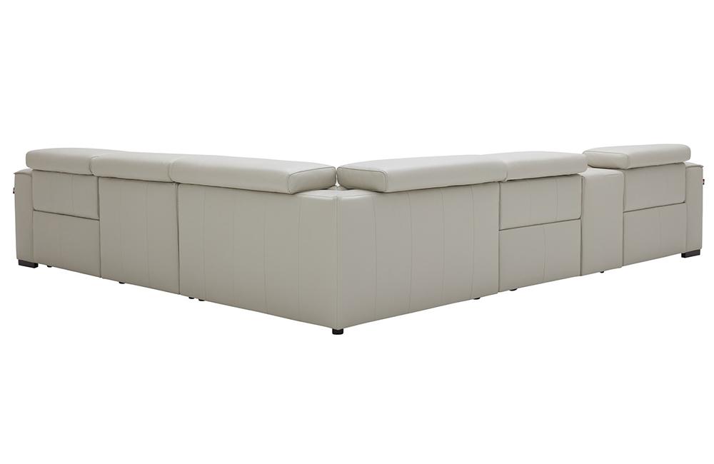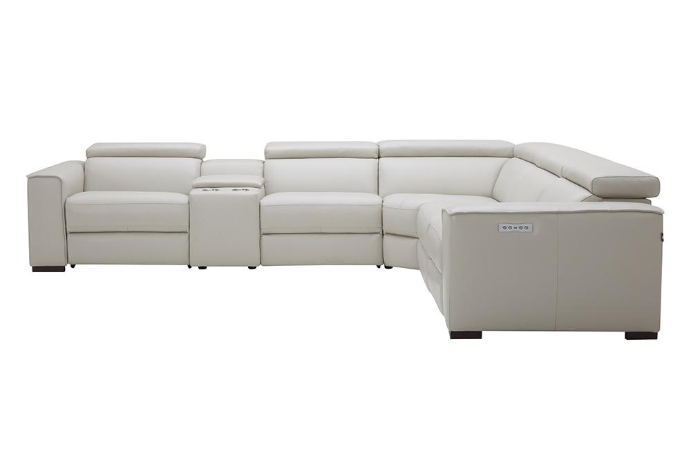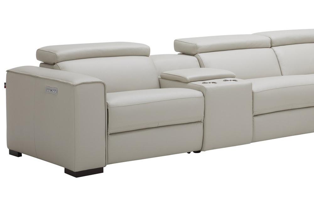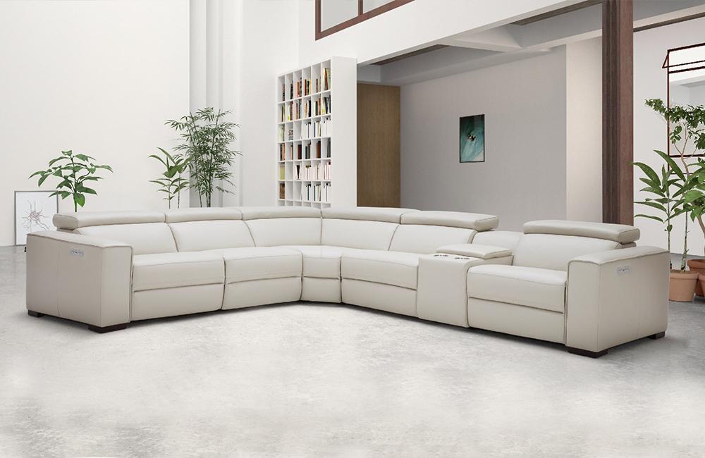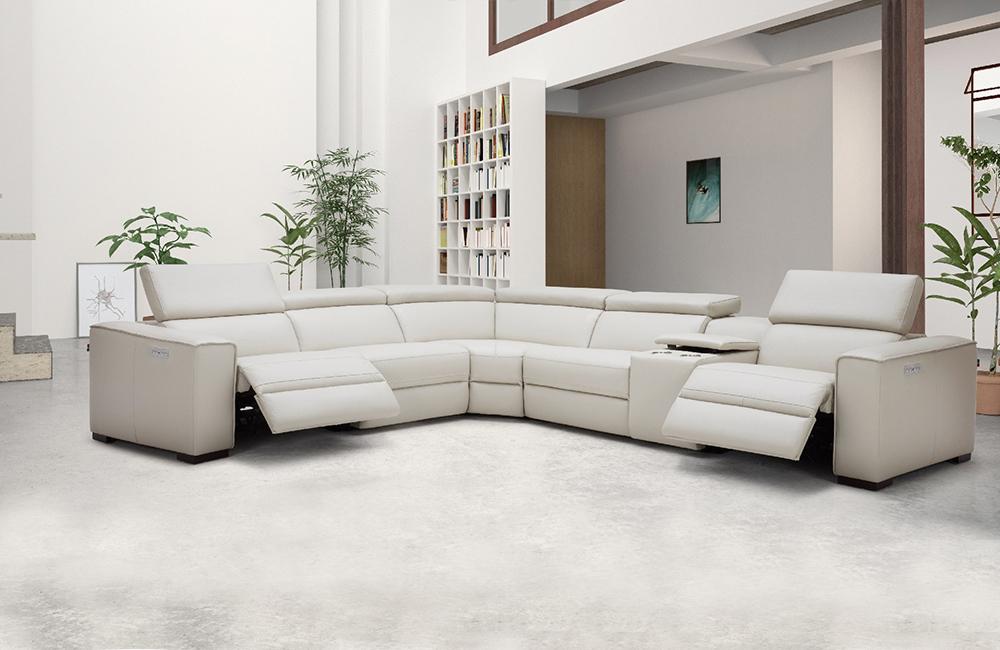 Visually Clean Lines and spacious seats set the Bellagio sectional apart from the standard. This iconic sectional is fully modular allowing you to have many options to configure it to your room's need. The Bellagio Motion Sectional features 3 powered recliners and headrests for maximum comfort. Crafted from Premium Top grain Leather all around, this 6 piece sectional features a convenient console with two cup holders plus storage, 2 end recliners, 1 arm less recliner, 1 stationary arm less & 1 plush corner cushion for ultra comfort and a solid oak frame to ensure long lasting use. Available in caramel, dark grey & silver grey.