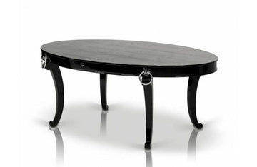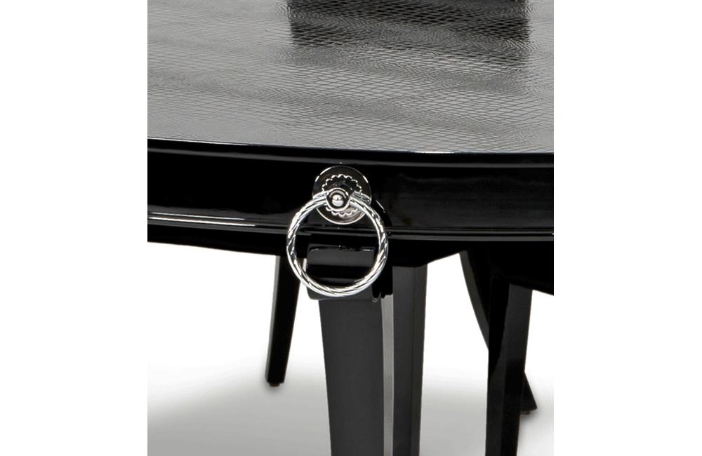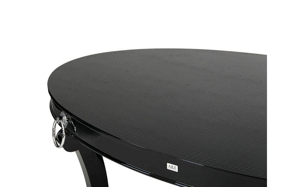 Bellagio Luxurious Dining table features laser-cut crocodile textured pattern. A rich finish polishes the design to perfection and is further enhanced with decorative metal chrome rings. The long legs slightly curl outward in a graceful curve adding fluid motion to the design. Six guests can comfortably sit around the table.