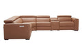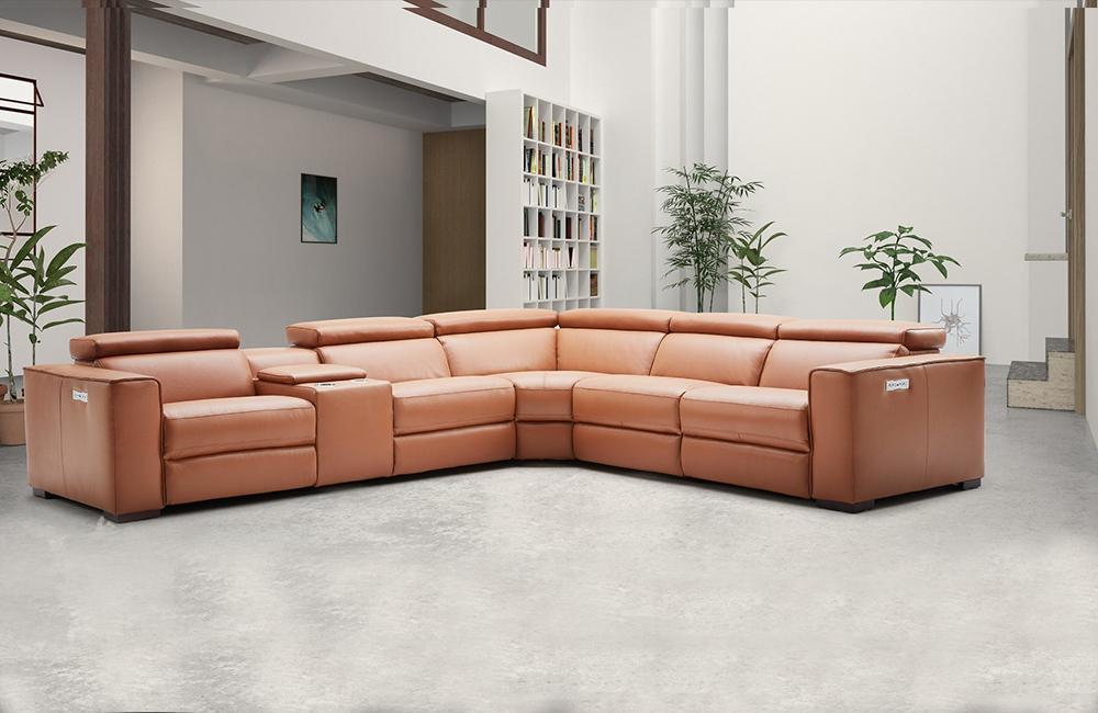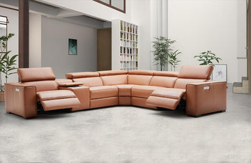 Visually Clean Lines and spacious seats set the Bellagio sectional apart from the standard. This iconic sectional is fully modular allowing you to have many options to configure it to your room's need. The Bellagio Motion Sectional features 3 powered recliners and headrests for maximum comfort. Crafted from Premium Top grain Leather all around, this 6 piece sectional features a convenient console with two cup holders plus storage, 2 end recliners, 1 arm less recliner, 1 stationary arm less & 1 plush corner cushion for ultra comfort and a solid oak frame to ensure long lasting use. Available in caramel, dark grey & silver grey.