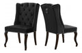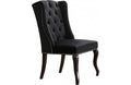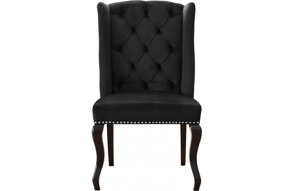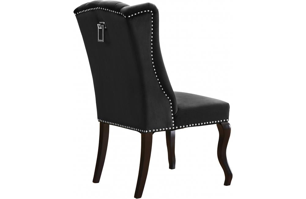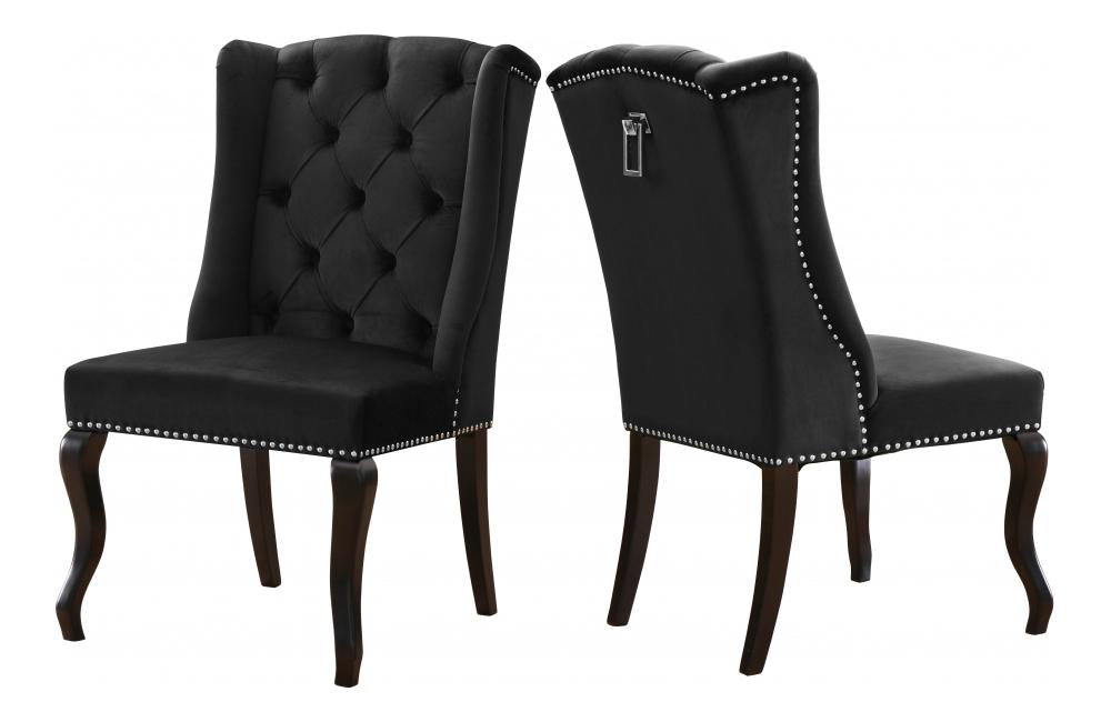 Bring luxury to mealtime with the Bernardo Black Velvet Dining Chair. This chair has a curvy, high back with an elegant look that blends modern with traditional. The back is tufted to prevent shifting of the padded cushion, and the chair has chrome nail head trim for added beauty and resilience. A chair knocker on the back lends an extra element of elegance to the design, and the wooden legs provide sturdy support and complete the design on a timeless note.