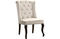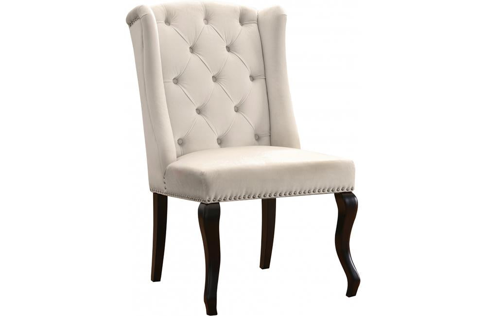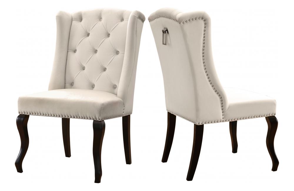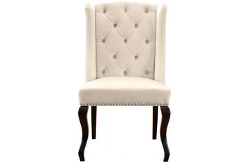 Bring luxury to mealtime with the Bernardo Cream Velvet Dining Chair. This chair has a curvy, high back with an elegant look that blends modern with traditional. The back is tufted to prevent shifting of the padded cushion, and the chair has chrome nail head trim for added beauty and resilience. A chair knocker on the back lends an extra element of elegance to the design, and the wooden legs provide sturdy support and complete the design on a timeless note.