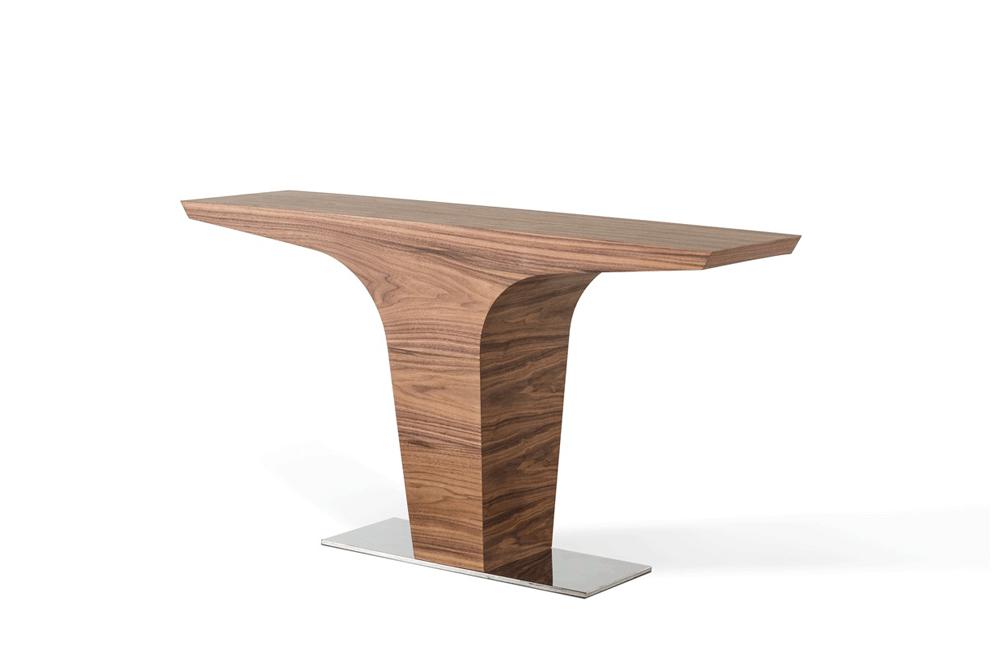 A walnut wood veneer finish covers the T-shaped Bismarck Console Table and the rectangular stainless steel base steadies the table.